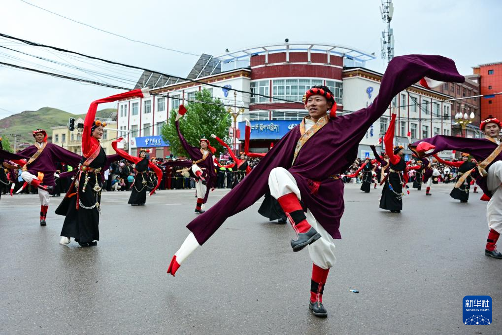 8月20日,在青海省玉树藏族自治州囊谦县,演员在欢迎巡游中表演。新华社记者 齐芷玥 摄