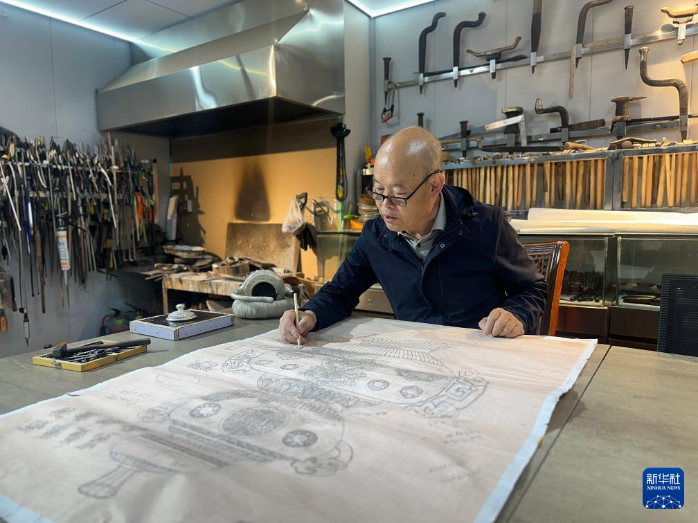 银铜器制作及鎏金技艺国家级代表性传承人何满正在绘图。新华社记者 张子琪 摄