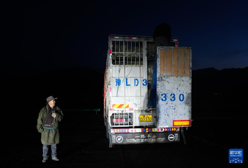 3月7日,在青海省海北藏族自治州祁连县阿柔乡草大板村,东宝准备将车辆中的羊群放归草原。新华社记者 张龙 摄