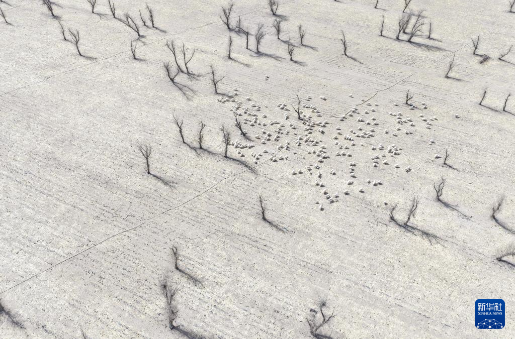 3月7日,在甘肃省张掖市甘州区碱滩镇二坝村的借牧点,羊群在玉米秸秆地中觅食(无人机照片)。新华社记者 张龙 摄
