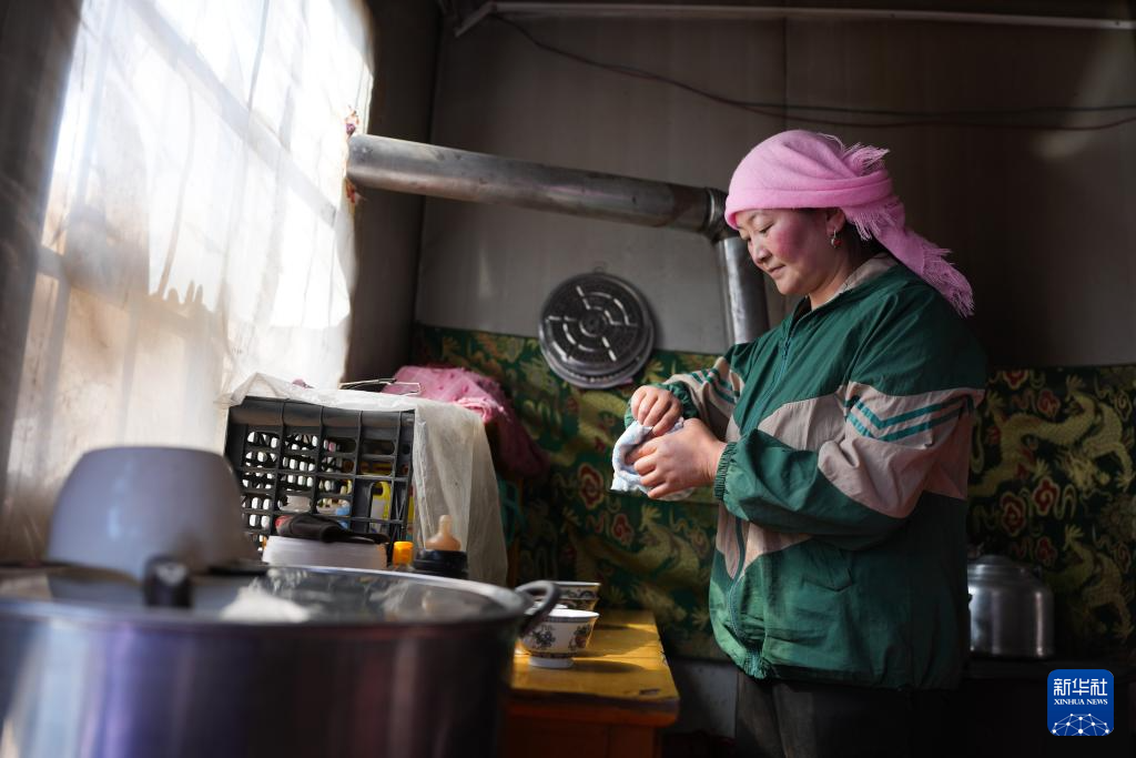3月7日,在甘肃省张掖市甘州区碱滩镇二坝村的借牧点,东宝的儿媳拉中在临时居住的简易板房内做家务。新华社记者 张龙 摄
