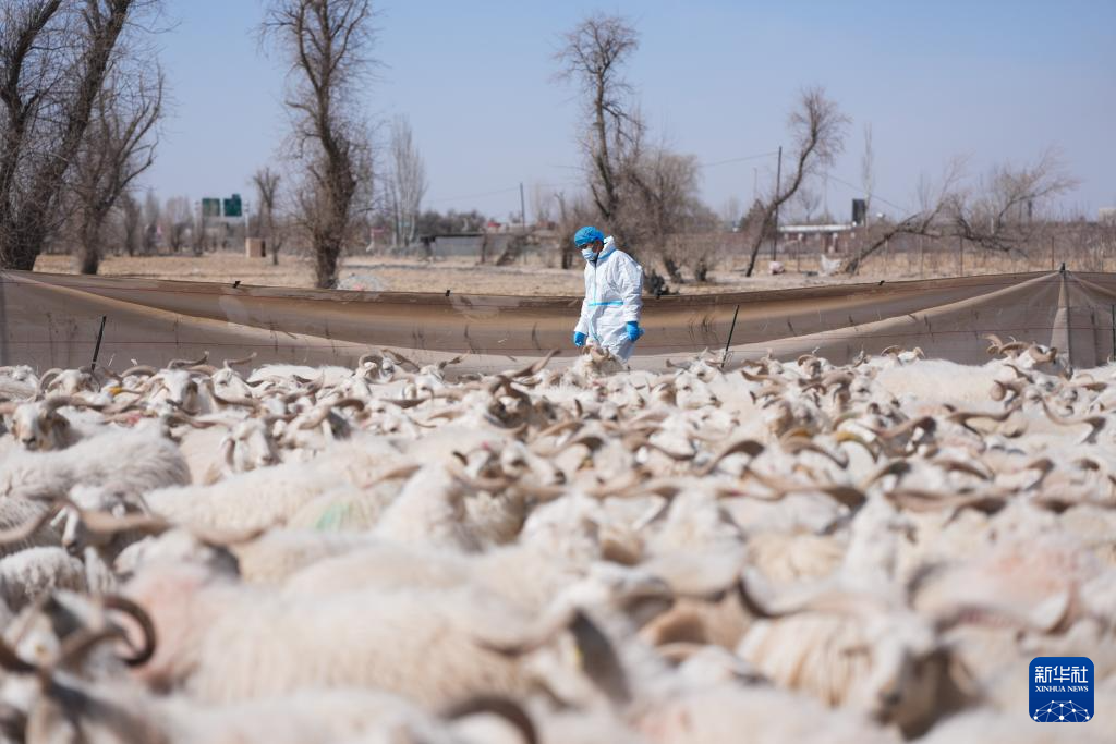 3月7日,在甘肃省张掖市甘州区碱滩镇二坝村的借牧点,祁连县农牧部门专业技术人员对返场装车前的羊群进行健康检查。新华社记者 张龙 摄